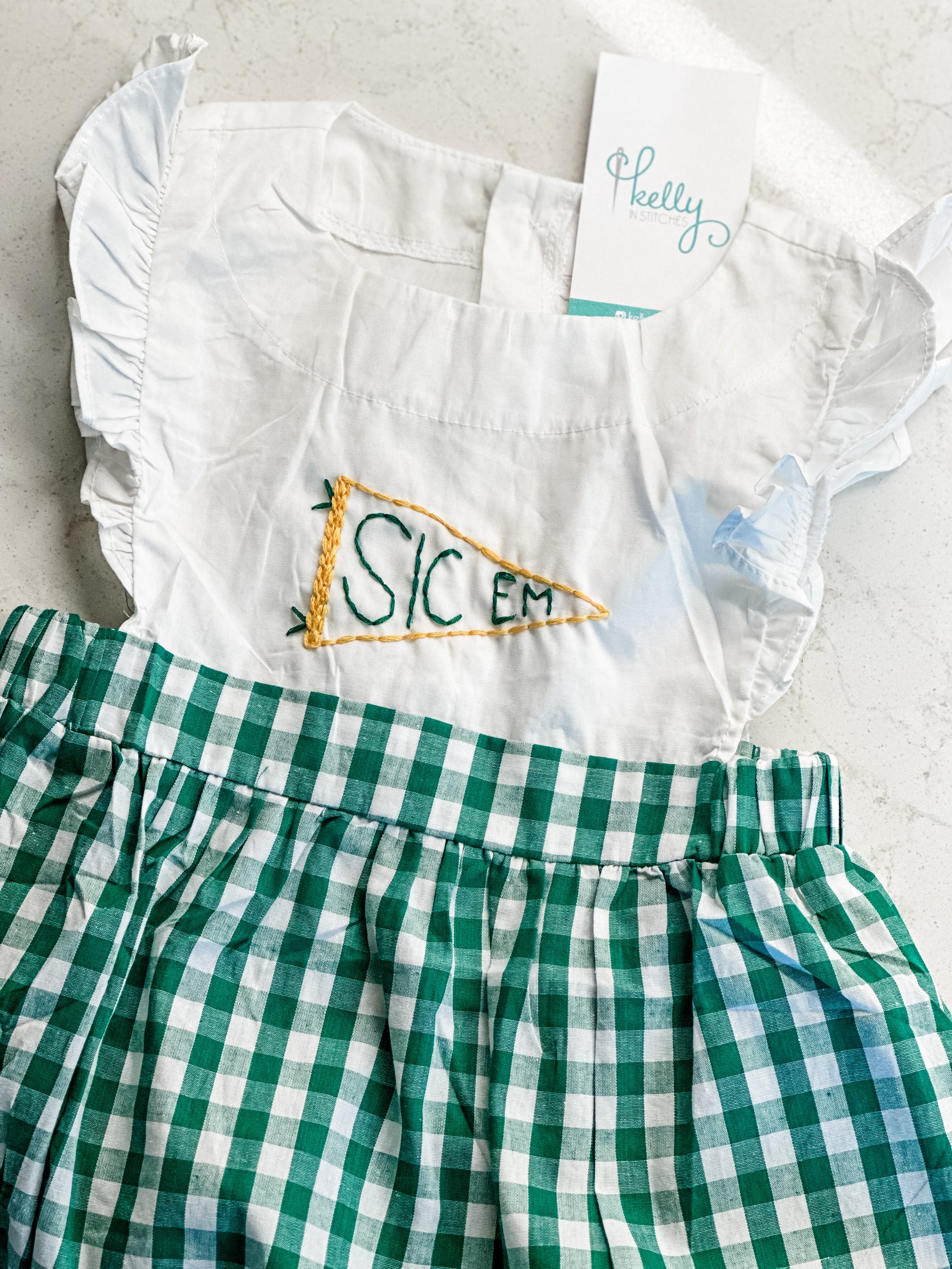 White poplin dress with gingham skirt hand embroidered with pennant with school name/phrase. Button back with elastic along ribcage. Size up if between sizes.